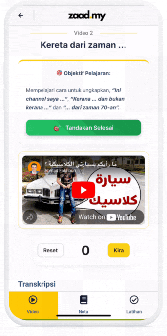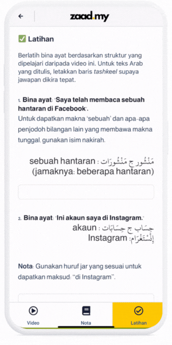 Mendengar atau menerima input sahaja tidak cukup! Berpandukan video dan nota yang diberikan, peserta diberikan latihan binaan ayat secara berpandu dan akan terus disemak secara automatik oleh platform Zaad.